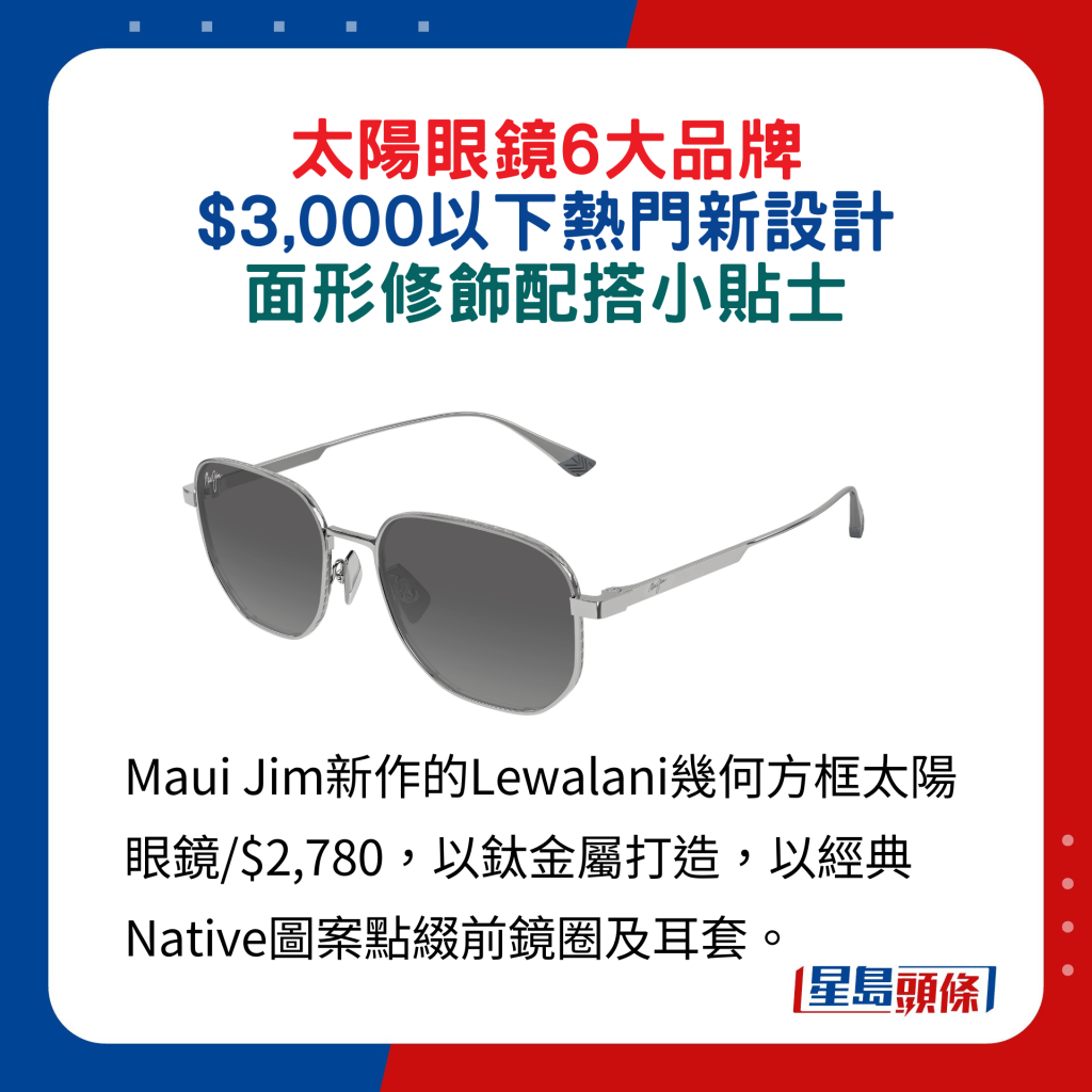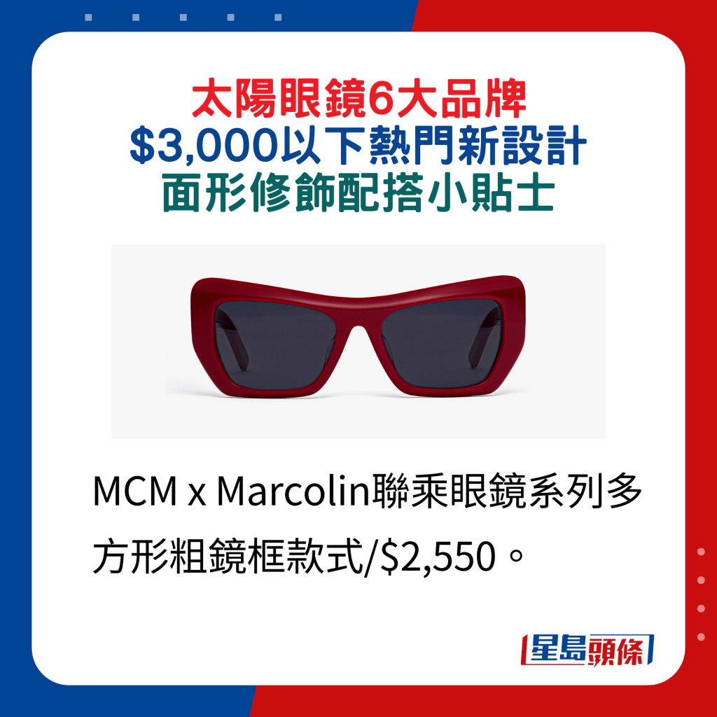Maui Jim新作的Lewalani幾何方框太陽眼鏡 $2,780,以鈦金屬打造,以經(jīng)典Native圖案點(diǎn)綴前鏡圈及耳套。MCM x Marcolin聯(lián)乘眼鏡系列多方形粗鏡框款式 $2,550。