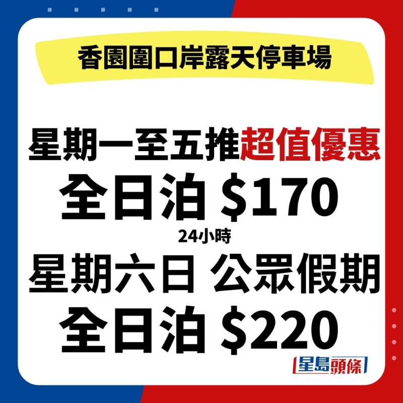 私家車(chē)日泊(任何24小時(shí))為$150;夜泊(晚上6時(shí)至翌日早上8時(shí))為$80;時(shí)租為$15。