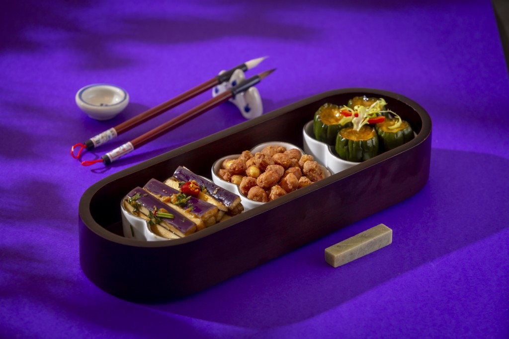 御名園以傳統(tǒng)中菜作招徠,店家最近推出結(jié)合經(jīng)典戲曲劇目《紫釵記》元素的全新4人中菜套餐(網(wǎng)上優(yōu)惠價(jià)$988,原價(jià)$1,788),多道精品中菜,包括玉簪三精品、相濡以沫、燈街拾翠、福祿海花斑、脆皮文昌雞及劍合釵圓等。以前菜玉簪三精品為例,是用首飾盒盛載涼拌茄子、醬青瓜和落花生,賣相精巧細(xì)膩,口感清新開胃。飯后甜品劍合釵圓,其實(shí)是用玉釵串起的紫薯水晶湯圓,造型精致,為盛宴畫上圓滿句號(hào)。