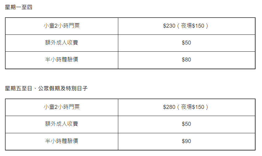 星期五至日 HK$280/2 組,共 2 大 2 小體驗(yàn) 每小時(shí)平均 HK$35/位(原價(jià) HK$280/2 小時(shí))