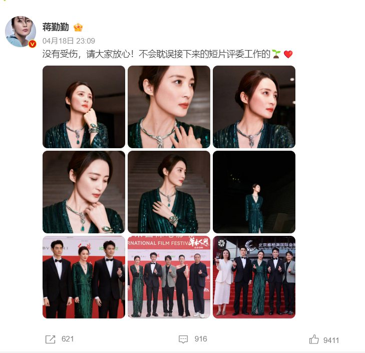 事后蔣勤勤在微博上發(fā)文報平安,“沒有受傷,請大家放心!不會耽誤接下來的短片評委工作的?!? /></a></p>