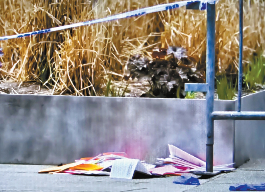 ▲自焚事件后,現(xiàn)場發(fā)現(xiàn)該男子向人派發(fā)的“反政府陰謀論”傳單。電視截圖