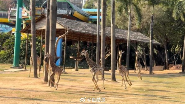 廣州長隆動物園數(shù)十只斑馬、長頸鹿“喪跑”避雨。