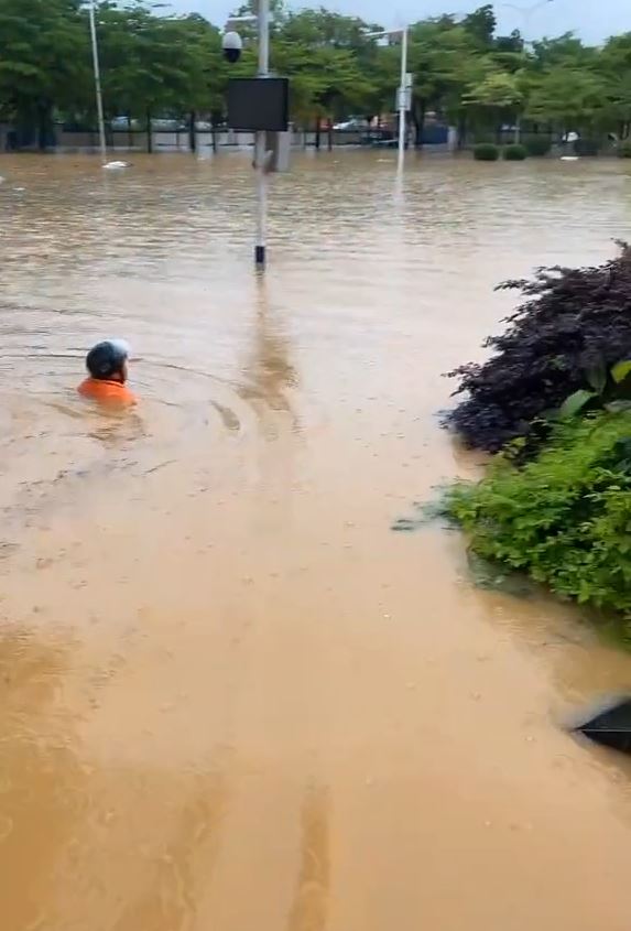 影片顯示,該名中年男子昨日中午戴著頭盔,在韶關(guān)武江區(qū)雅居藍(lán)灣附近,已被洪水淹至其肩部,疑繼續(xù)在水下駕著電動(dòng)單車緩慢前行。
