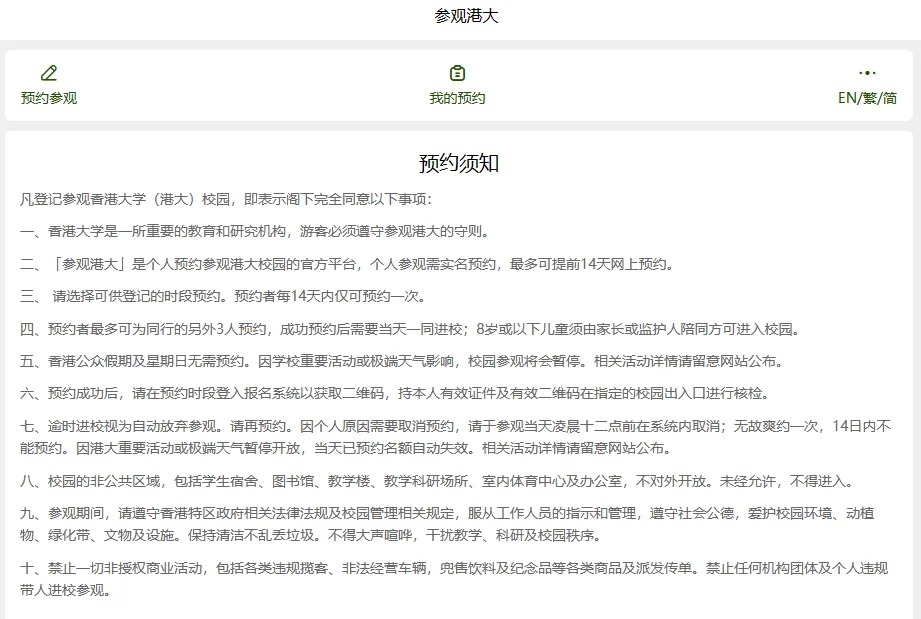 每節(jié)參觀時(shí)段為兩小時(shí),均設(shè)有名額上限。預(yù)約成功后,到訪游客將獲得入場(chǎng)二維碼,并須通過指定地點(diǎn)進(jìn)出港大校園。