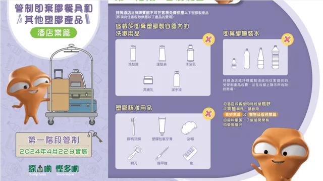 餐飲處所禁止向顧客提供9類即棄膠餐具,酒店也不可免費提供即棄瓶裝水、洗漱梳妝用品,商戶也不可派發(fā)即棄雨傘袋,銷售即棄塑料棉花棒、膠牙簽及牙線棒等物品。