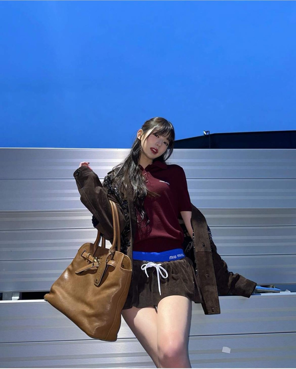 ▲韓團IVE成員張員瑛以Polo衫襯束繩迷你裙,再配以大號皮革Tote Bag,造型剛?cè)峒鎮(zhèn)?。(圖片來源:IG@for_everyoung10)