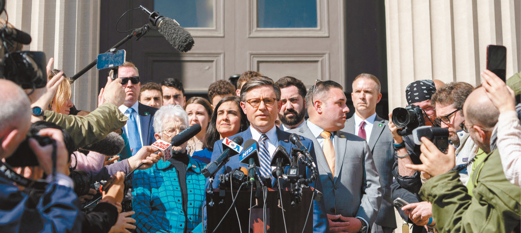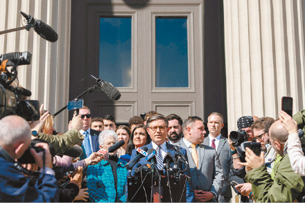 ▲眾議院議長約翰遜(中)在多名共和黨議員陪同下,在哥大的洛伊圖書館外舉行記者會,表示哥大校長若無法控制抗議活動便應(yīng)辭職。路透社