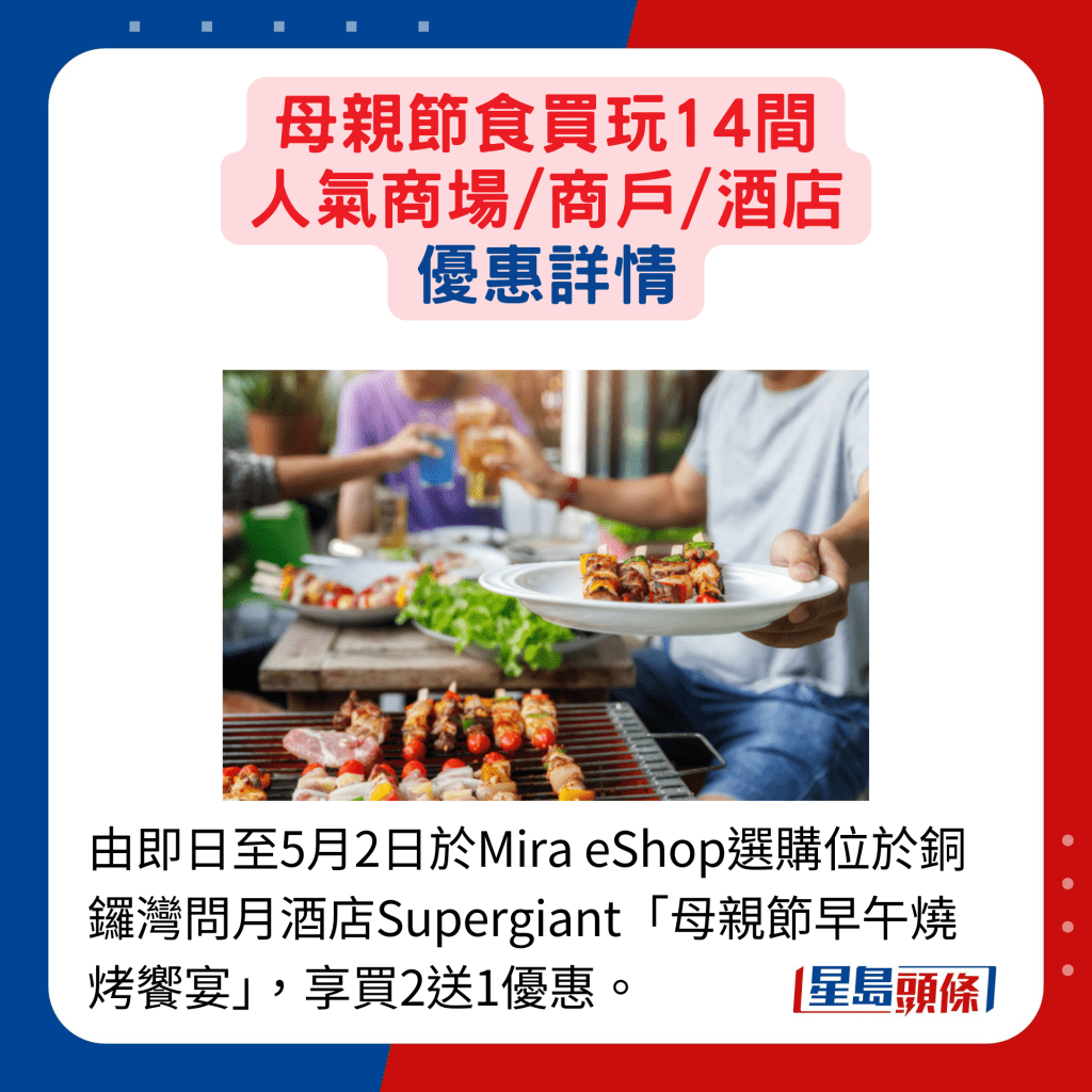 慶祝母親節(jié),嘆美食是必備環(huán)節(jié)。北角海逸酒店綠怡咖啡廳母親節(jié)自助早午餐及晚餐,于5月12日惠顧,每位媽媽可免費(fèi)獲贈(zèng)紅絲絨蛋糕。若經(jīng)酒店eShop預(yù)購(gòu),可享優(yōu)惠如買(mǎi)2送2(購(gòu)買(mǎi)2位成人,同行2位客人(成人/長(zhǎng)者/小童)免費(fèi),又或購(gòu)2位成人,其中同行1位母親免費(fèi)等。至于銅鑼灣問(wèn)月酒店的Supergiant推出“母親節(jié)早午燒烤饗宴”優(yōu)惠,于5月2日或之前在美麗華集團(tuán)網(wǎng)店Mira eShop選購(gòu),可享買(mǎi)2送1優(yōu)惠。