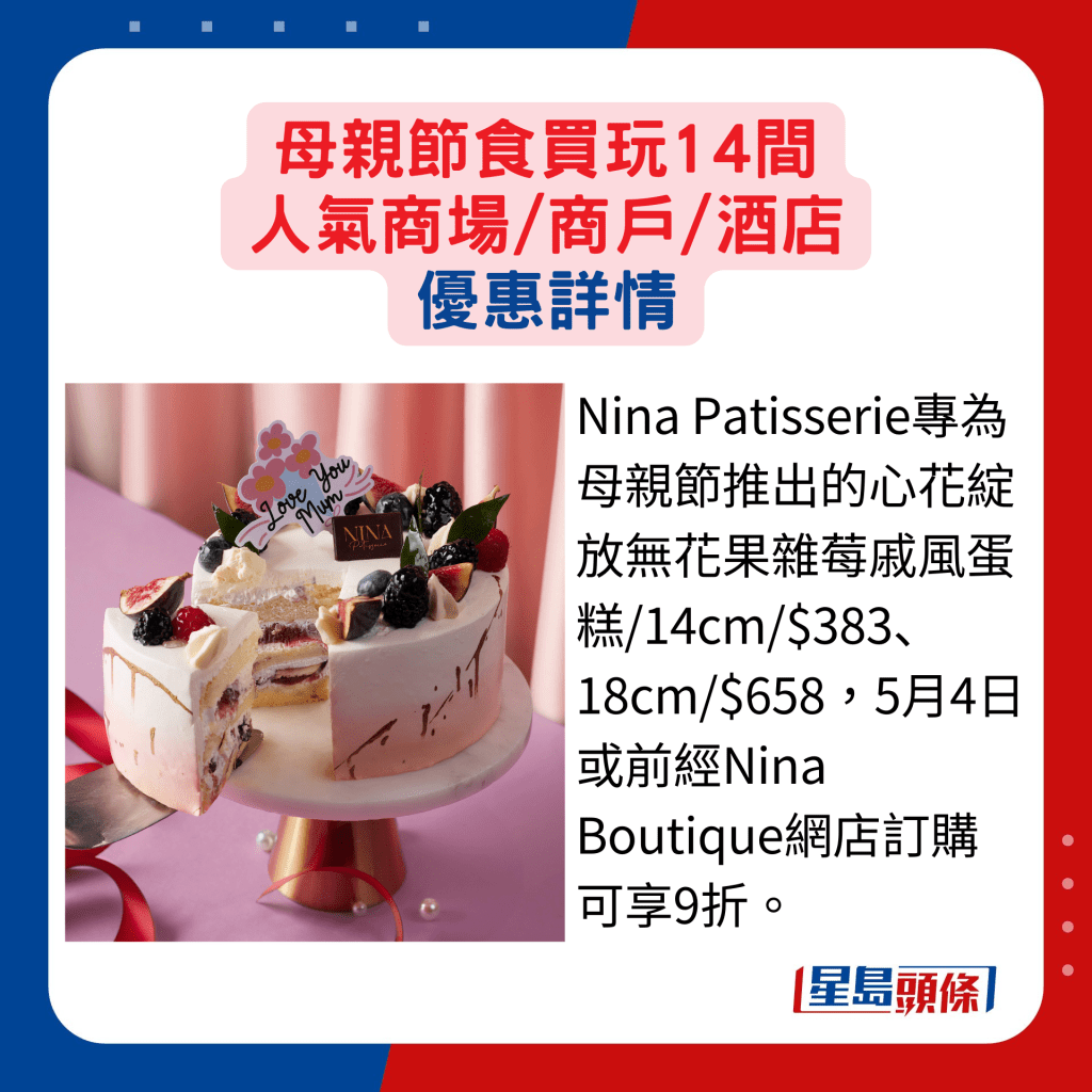 假如想買(mǎi)母親節(jié)蛋糕,時(shí)尚甜點(diǎn)品牌Nina Patisserie正有新推出的心花綻放無(wú)花果雜莓戚風(fēng)蛋糕,只要在5月4日或之前經(jīng)Nina Boutique網(wǎng)店訂購(gòu)可享9折,另美心西餅亦新推For Her母親節(jié)蛋糕系列,于5月9日前選購(gòu)指定款式則享85折。