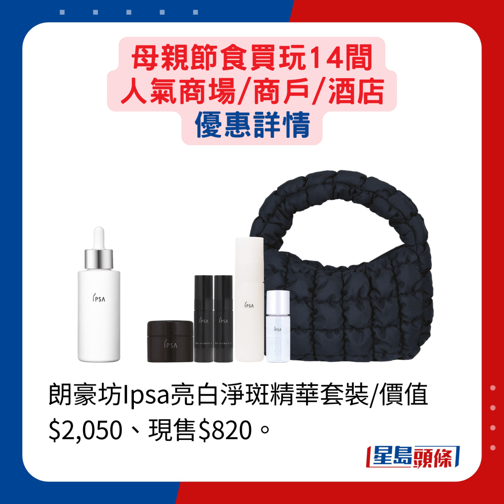 人氣百貨及商場(chǎng)商戶都有推出迎合母親節(jié)的推廣活動(dòng),產(chǎn)品網(wǎng)羅時(shí)裝配飾、護(hù)膚及美妝品等。崇光百貨由即日至5月26日舉行感謝祭,逾百國(guó)際品牌的指定產(chǎn)品提供不同折扣優(yōu)惠,SOGO Rewards會(huì)員買(mǎi)滿指定金額,更可獲現(xiàn)金券或以優(yōu)惠價(jià)換購(gòu)指定產(chǎn)品等。想選購(gòu)美妝護(hù)膚品的話,朗豪坊由即日至5月12日舉行Langham Beauty Fest S/S 2024,逾60個(gè)國(guó)際美容品牌如Shiseido、SK-II、YSL BEAUTé、Armani Beauty及IPSA等,推出超過(guò)300款低至3折的獨(dú)家禮遇、配搭優(yōu)惠及限量激賞,例如Shiseido指定眼膜買(mǎi)一送一,另價(jià)值$2,050的IPSA亮白凈斑精華套裝,就減至$820發(fā)售。