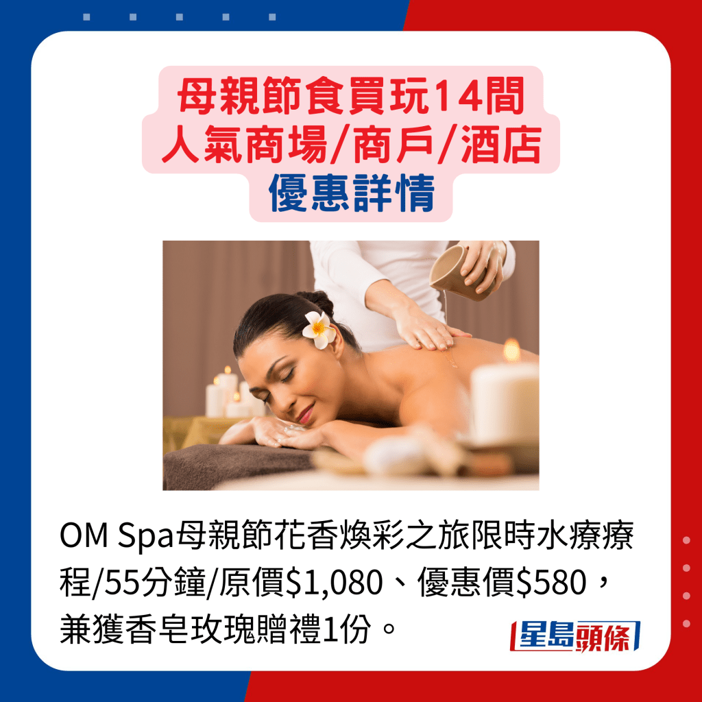 送給媽媽酒店級(jí)的按摩及水療,讓她放松身心,最好不過(guò)。機(jī)場(chǎng)富豪酒店及沙田麗豪酒店的OM Spa,趁節(jié)日推出花香煥彩之旅限時(shí)水療療程,原價(jià)$1,080,現(xiàn)售$580,接近半價(jià)已可享受招牌香薰按摩療程,又或極致保濕面部護(hù)理,更可獲贈(zèng)香皂玫瑰。