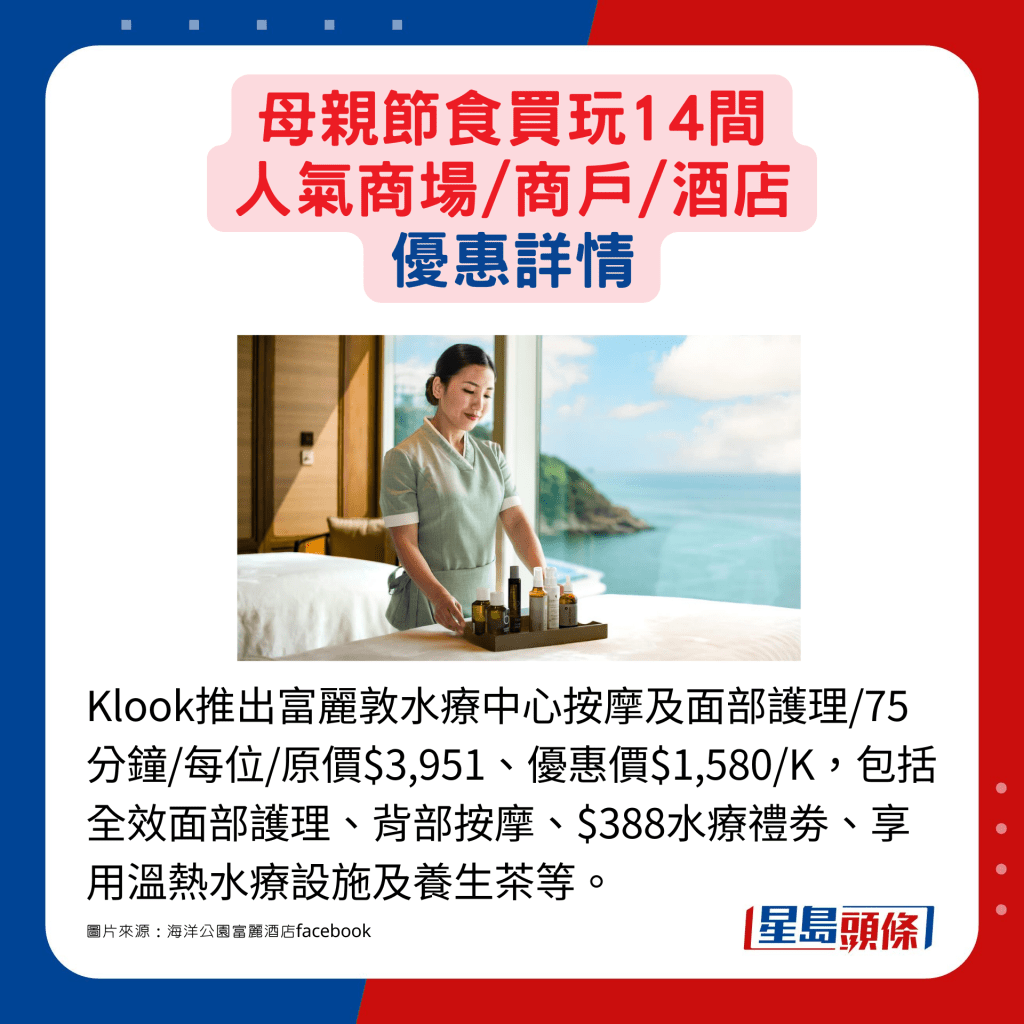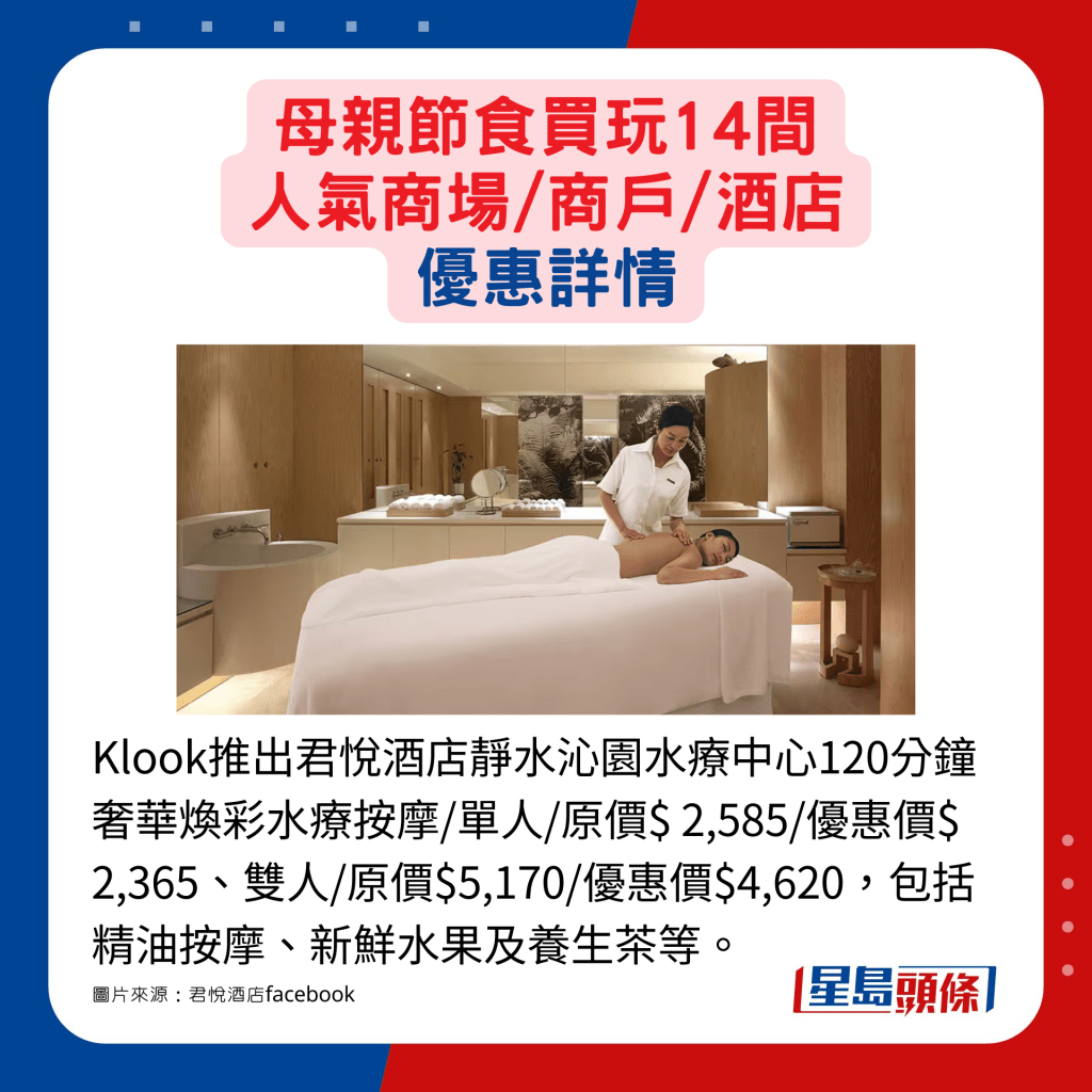 旅游玩樂(lè)平臺(tái)網(wǎng)站Klook亦有推出酒店按摩及水療推廣,例如可以優(yōu)惠價(jià)$1,580享受富麗敦水療中心的75分鐘按摩及面部護(hù)理,更可同時(shí)獲贈(zèng)水療禮券、享用泳池及溫?zé)崴熢O(shè)施等,媽媽大可盡情享受Me Time。