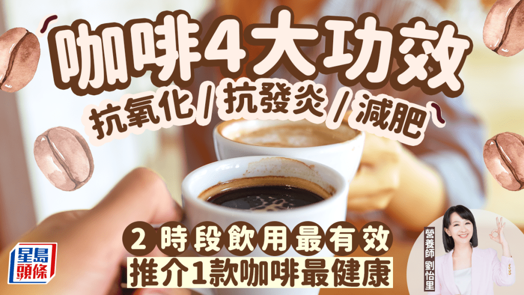 飲咖啡除了可提神,踢走“Blue Mondy”,還有燒脂減肥、抗氧化等4大功效!喝多少才最有效?有營(yíng)養(yǎng)師教飲咖啡10大貼士,并推介1款最健康的咖啡。 她指出,在2個(gè)黃金時(shí)段飲用,可大大提升咖啡的功效!