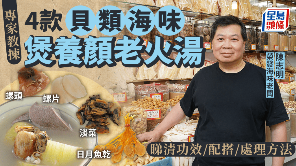 海味湯|曬干的貝類(lèi)海味,如螺頭、螺片、日月魚(yú)干及淡菜,味道特別鮮香濃郁,是常用湯水材料,并且各具食療功效。今日由灣仔榮發(fā)海味的負(fù)責(zé)人陳志明,講解螺頭、螺片、日月魚(yú)干及淡菜的選購(gòu)方法、處理方法、功效及煲湯配搭,讓食材發(fā)揮最佳的味道及功效,煲出鮮味有營(yíng)的食療湯水。