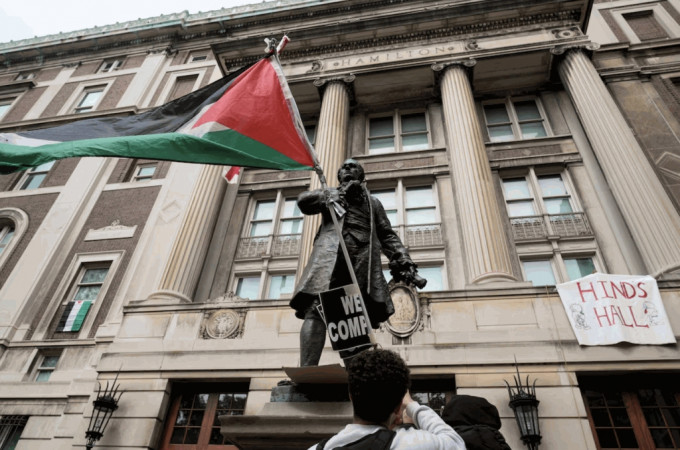 哥倫比亞大學(xué)扎營聲援巴勒斯坦的示威者不理會校方要求在當(dāng)?shù)貢r間周一下午2時前清場,在限期過后仍留在示威場地,校方表明開始對拒絕離場的示威學(xué)生采取停學(xué)處分。未料學(xué)生不僅未有被嚇退,反而將行動升級,在30日凌晨闖入并占據(jù)該校校舍“漢彌爾頓大樓”,封鎖大樓出入口,掛出巴勒斯坦旗幟,這項行動勢令蔓延美國各大學(xué)校園的挺巴行動情勢升溫。
