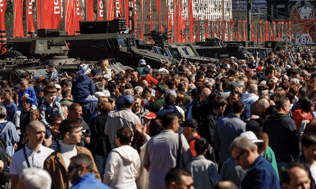 ▲俄羅斯軍方在首都莫斯科展出從烏克蘭繳獲的武器戰(zhàn)利品,引來(lái)萬(wàn)人空巷圍觀。路透社