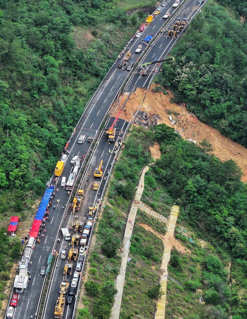 溫勇登又指,塌方區(qū)域狹長,墮坡車輛大部分集中在塌方區(qū)附近,再加上近期強降雨多,現場土質疏松,大型救援裝備難以進入核心救援區(qū)。 救援初期,只能在一個工作面開展救援。