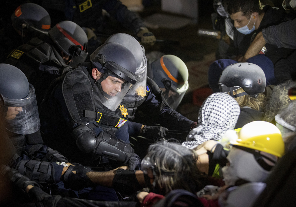 綜合美聯(lián)社及路透社報(bào)道,周四凌晨時(shí)分,數(shù)百名穿著頭盔的警察,以擴(kuò)音器警告,若示威者不散去,就會(huì)被逮捕,并敦促示威者清理抗議區(qū)。警方在外校集結(jié)數(shù)小時(shí)后,大約凌晨3時(shí)許采取行動(dòng),進(jìn)入加州大學(xué)洛杉磯分校,一字排開推進(jìn),并拆除校內(nèi)支持巴勒斯場示威者的路障及營地。據(jù)報(bào),警方向示威者投擲閃光燈,示威者則手牽手阻止警方前進(jìn),有示威者與警察發(fā)生糾纏。