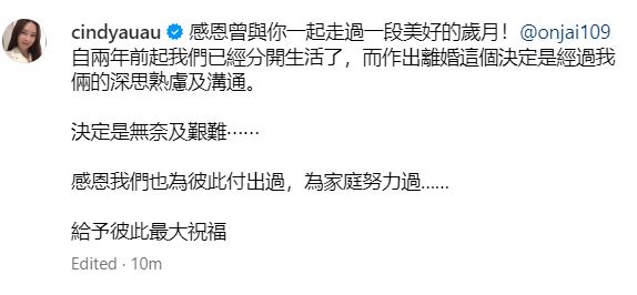 其實(shí)歐倩怡已久未曬出家庭照,即使有子女合照亦未見郭晉安,而早前歐倩怡外游,連日在IG分享旅行照同樣未見郭晉安身影。本以為二人作風(fēng)低調(diào),豈料原來早已分居。歐倩怡近年進(jìn)修多個(gè)學(xué)位成為營養(yǎng)師,更息影找了份全職營養(yǎng)師工作。網(wǎng)民猜測(cè)歐倩怡與郭晉安因距離漸遠(yuǎn)而感情變淡,加上年齡相差15年可能亦是離婚原因之一,不過從歐倩怡與郭晉安的帖文可見,二人強(qiáng)調(diào)是和平分開。