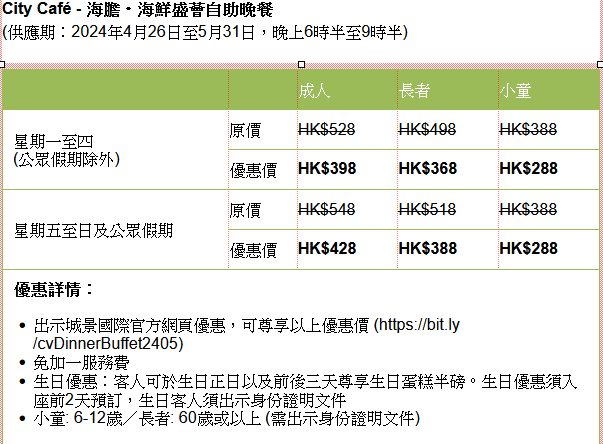 價錢:成人/$468起、長者/$438起、小童/$388起