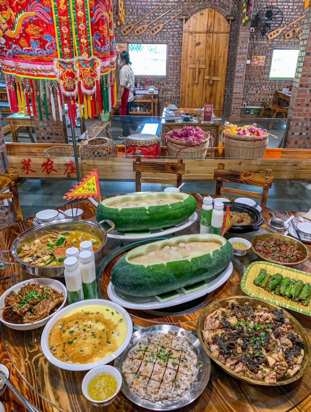 佛山康喜萊農(nóng)莊位于佛山文創(chuàng)古鎮(zhèn)白坭的西江河鮮美食街內(nèi),是佛山首間龍舟主題餐廳,前庭餐廳提供龍舟文化展覽、餐飲美食,最夸張是那張13.8米長(zhǎng)的龍船桌,是目前佛山市內(nèi)唯一一張以五人龍舟文化為載體的巨型餐桌,可以容納50人用餐。后庭有二十多種農(nóng)作物、十多種時(shí)令水果,提供新鮮食材,也是農(nóng)場(chǎng)觀光、親子活動(dòng)的好去處。農(nóng)莊有四大招牌打卡美食,必吃冬瓜艇,用一個(gè)長(zhǎng)冬瓜刮空作為容器,放上冬瓜肉、蝦、貝類、豬肚、肉丸等,湯味鮮甜。其他三種是金錢(qián)蓮燉湯、秘汁蟹壬雞、龍船飯,人氣美食有佛山原創(chuàng)雞煲蟹、禾稈蓋珍珠,和以“三水黑皮冬瓜”首創(chuàng)翡翠撞奶、翡翠糕、翡翠冰粉等特色小吃。