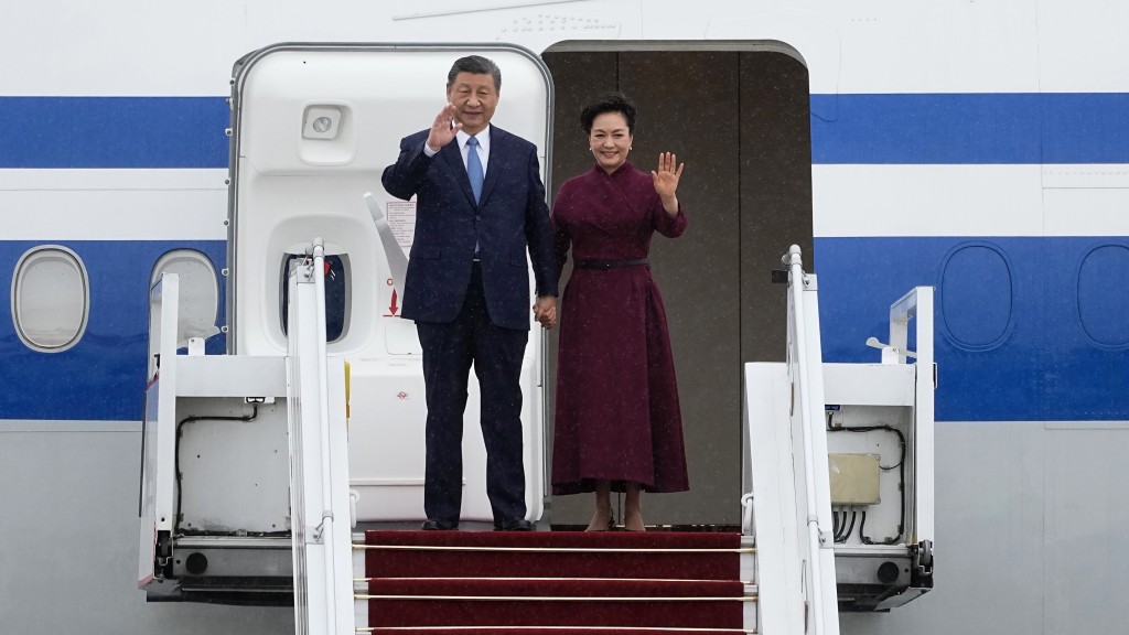 ▲習(xí)近平與夫人彭麗媛步出機艙后揮手示意。美聯(lián)社