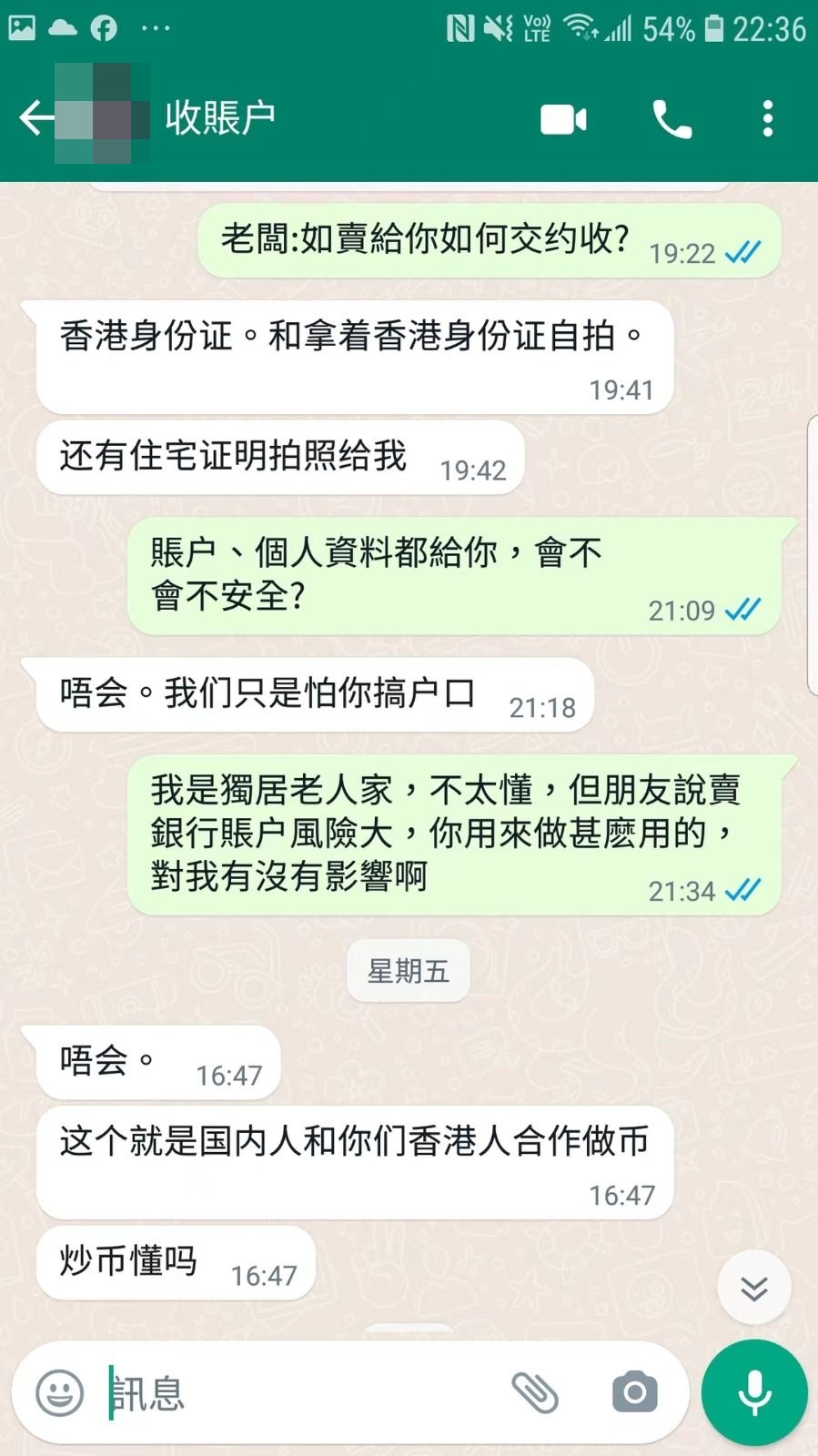 記者隨后與網(wǎng)名李X的收購者聯(lián)絡,對方稱只買不租,收購價5000元,若有意出售,需拍攝及發(fā)送身份證和住址證明,并拿著身份證自拍容貌,強調(diào)有關要求是為防止賣家“搞戶口”(出售后繼續(xù)操作戶口及盜取戶口內(nèi)款項),又強調(diào)收購目的不是用作收取詐騙款項等非法用途,“這個就是國內(nèi)人跟你香港人合作做幣,炒幣,懂嗎?”