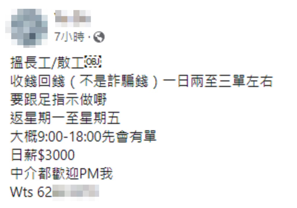 此外,一些包括青少年的人士為“搵快錢”替詐騙集團上門收取受害人的騙款,有關不法工作的招聘貼文亦在社交群組可見,記者在某招聘兼職的社交群組發(fā)現(xiàn)一個貼文注明“收錢回錢(不是詐騙錢)……日薪3000元”,于是留言聯(lián)絡,未幾獲告知所收款項包括不法資金:“干凈同唔干凈嘅錢都有,例如一個檔口拎完錢再拎返畀個老細先”。
