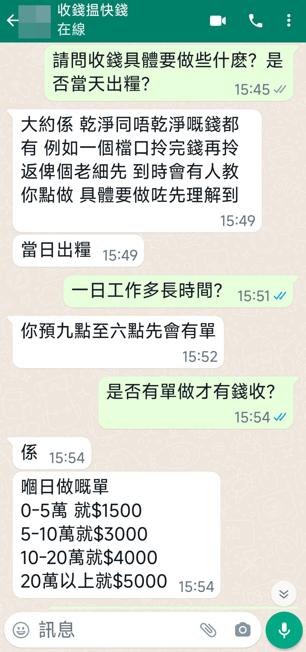 對方續(xù)稱,收款工作時間一般是早上9時至傍晚6時,收入按每次收款計算,若收取5萬元以下金額有1500元報酬,收取5至10萬有3000元得益,領取10至20萬元則有4000元,20萬元以上有5000元收益,但拒絕透露工作細節(jié):“到時會有人教你點做,具體要做咗先理解到,同意做嘢嘅話要身份證、住址證明,始終拎嘅都系錢!”