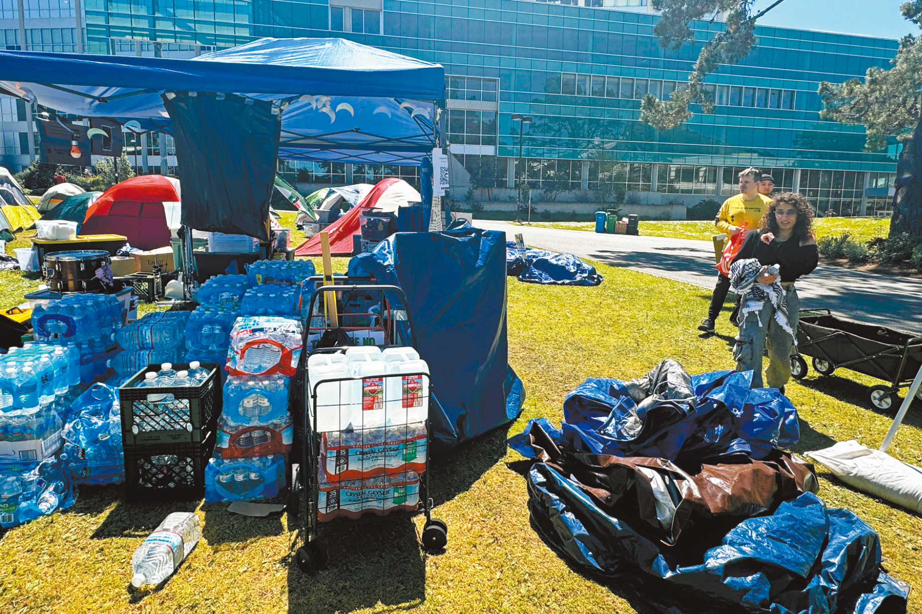 在舊金山州大圖書館前的草地上,親巴勒斯坦學(xué)生的反戰(zhàn)扎營(yíng)規(guī)模大致與上個(gè)星期一樣,約有50個(gè)帳篷,營(yíng)地除設(shè)有物資補(bǔ)給、籌款攤位、公眾演講區(qū)外,幾天前還新增圖書閱讀區(qū)、媒體采訪專區(qū)和死難者悼念專區(qū)等,不斷有熱心民眾為學(xué)生們送上物資,包括毛毯、防潮墊、整理箱、食物和水等。