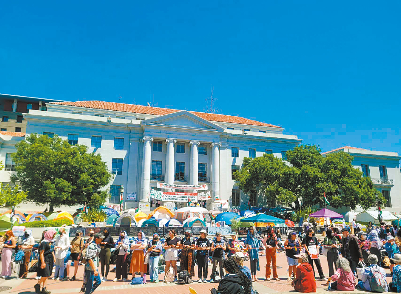 與此同時(shí),柏克萊加大(UC Berkeley)的同類學(xué)生扎營(yíng)行動(dòng)規(guī)模擴(kuò)大。上周五(3日)校內(nèi)舉行舉行公開活動(dòng)的斯普勞爾(Sproul)廣場(chǎng)一側(cè)被臨時(shí)封閉,建起“校友村”(Alumni Village)營(yíng)地,使原本50多個(gè)帳增至180多個(gè)。該營(yíng)地于 4月 22日建立,學(xué)生們的訴求和舊金山州大的大致一樣。來自馬來西亞的華人家長(zhǎng)黃先生周五帶著兒子到柏克萊加大校園參觀,見到有人拉繩圍成人墻,保護(hù)穆斯林學(xué)生在內(nèi)祈禱,他慨嘆美國有真正的言論自由,“中東回教國家根本沒有那樣的自由?!?/span>