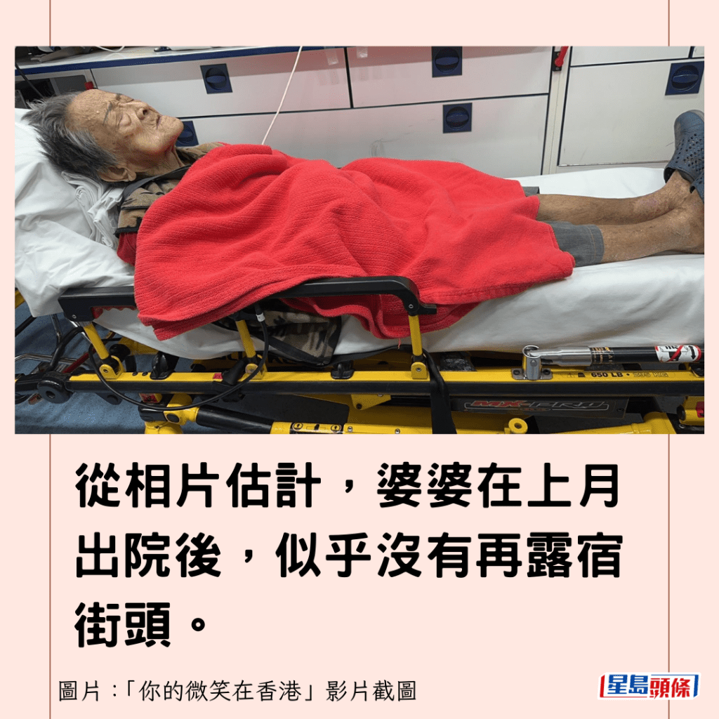 從相片估計,婆婆在上月出院后,似乎沒有再露宿街頭。