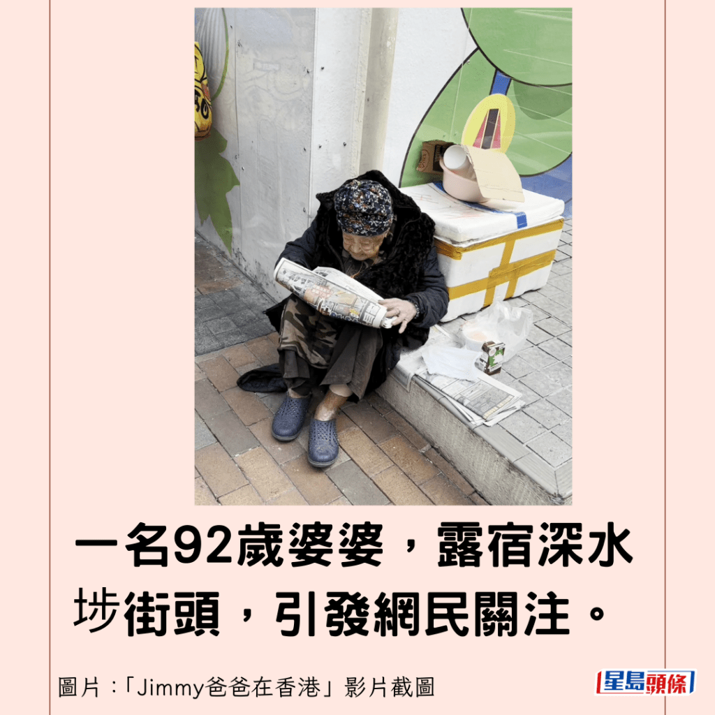92歲婆婆露宿深水埗街頭這位街頭露宿的婆婆姓潘,成為小紅書及抖音的熱議焦點,不少網民特地到場,噓寒問暖,又送贈食物給她。