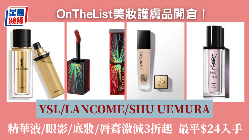 OnTheList美妝護(hù)膚品牌開倉優(yōu)惠低起3折!由即日起至5月12日,OnTheList購物平臺(tái)網(wǎng)站推出美妝護(hù)膚品開倉大減價(jià),L'Oréal旗下化妝品牌包括YSL、LANCOME、植村秀SHU UEMURA等,多款護(hù)膚精華液、眼影、皇牌唇膏以3折起發(fā)售,想趁減價(jià)為化妝品及護(hù)膚品換季,記得留意優(yōu)惠詳情!