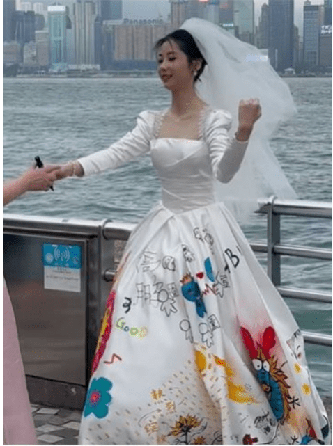 近日,有內(nèi)地網(wǎng)民在社交平臺(tái)小紅書(shū)發(fā)文,分享在維港遇見(jiàn)穿著特別婚紗的新娘,直言是“看到了幸福的具象化”!該新娘身穿一襲白色長(zhǎng)裙款式婚紗,下半身的裙上畫(huà)滿(mǎn)色彩繽紛的手繪圖案,包括有可愛(ài)的貓、太陽(yáng)花、卡通版的龍、飛天豬等等,看上去充滿(mǎn)童趣與繽紛的藝術(shù)氣息。 除此之外,新娘的賓客們更可以即場(chǎng)在婚紗裙上留下親筆簽名、畫(huà)畫(huà)等,賓客們紛紛成為創(chuàng)作婚紗的一份子,令整個(gè)結(jié)婚過(guò)程份外深刻、非常有紀(jì)念價(jià)值!