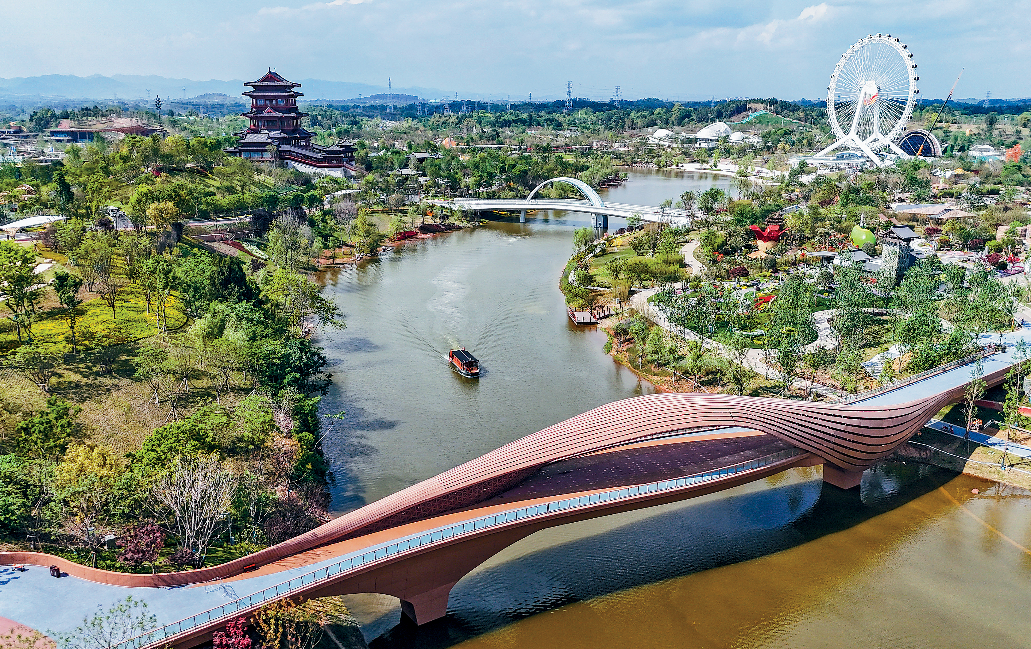 本屆成都世界園藝博覽會,破天荒設(shè)有1個主會場及4個分會場,主會場位于88米高的“天府眼”摩天輪所在的成都東部新區(qū)絳溪河生態(tài)廊道中部,4個分會場則分別在市內(nèi)的溫江、郫都、新津及邛崍地區(qū)。