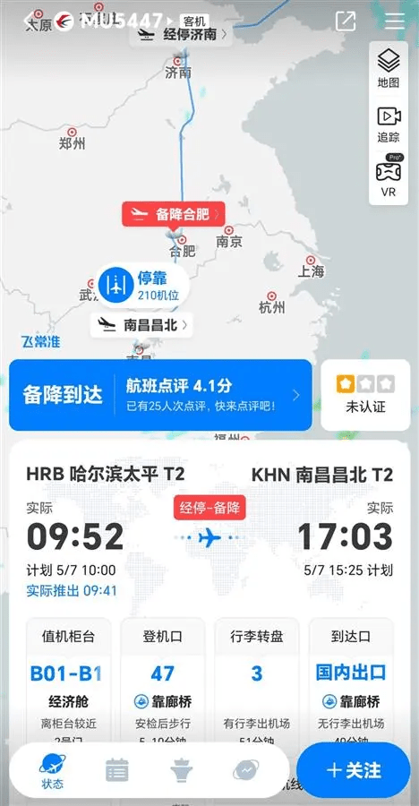 飛常準(zhǔn)APP顯示,MU5447從哈爾濱飛往南昌,經(jīng)停濟(jì)南。5月7日,該航班在飛行途中備降合肥。