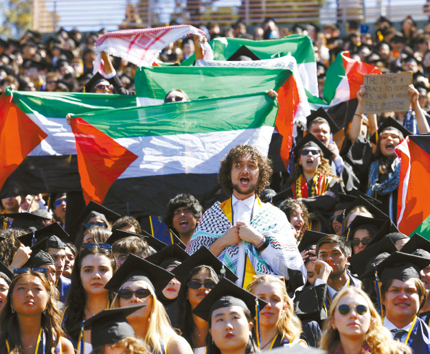 ▲有支持巴勒斯坦的抗議學生在柏克萊加大的畢業(yè)典禮上高舉標語和喊口號。Yalonda M. James/三藩市紀事報/美聯(lián)社