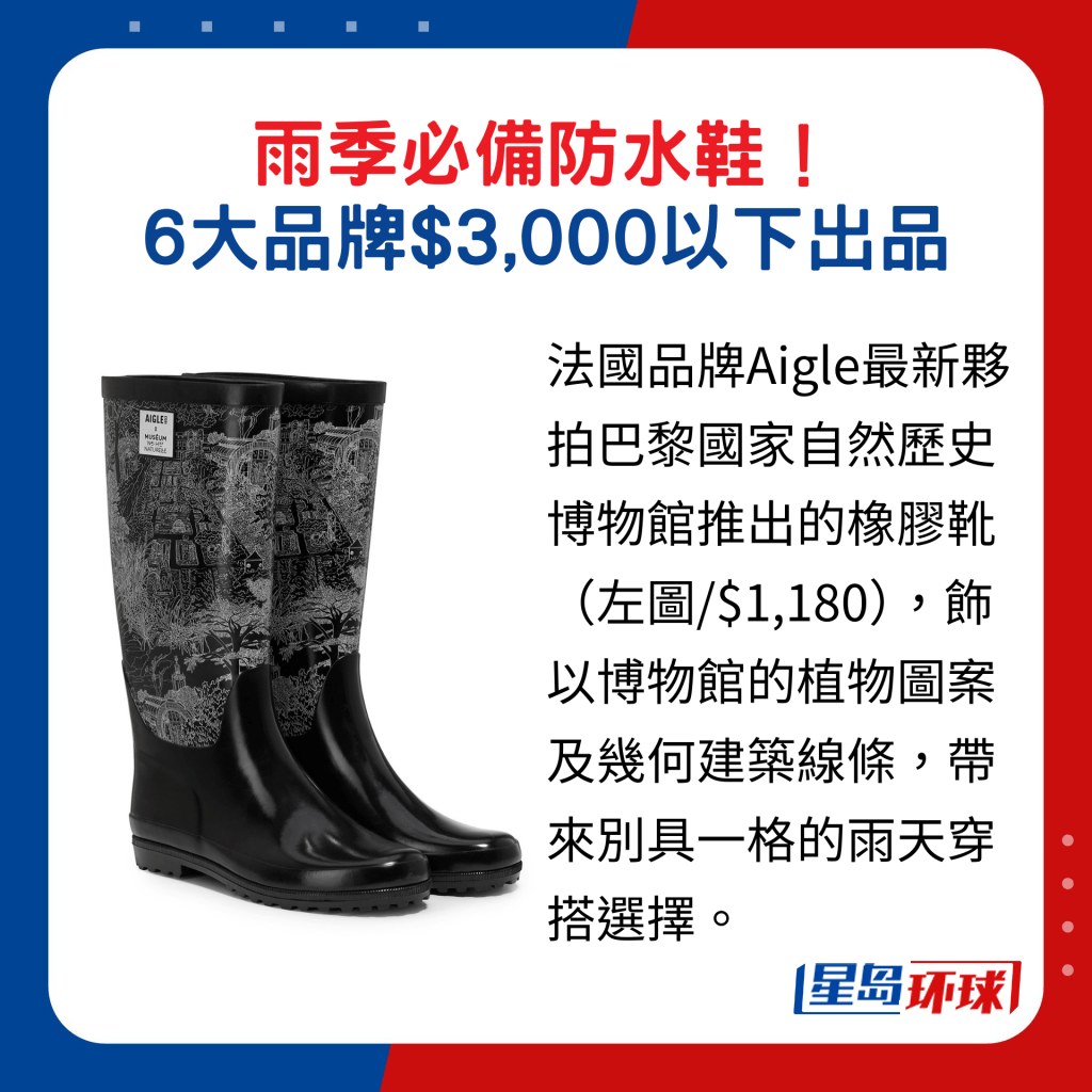 雨靴向來不乏捧場客,法國品牌Aigle最新伙拍巴黎國家自然歷史博物館推出的橡膠靴與防水斗篷,均飾以博物館的植物圖案及幾何建筑線條,帶來別具一格的雨天穿搭選擇。