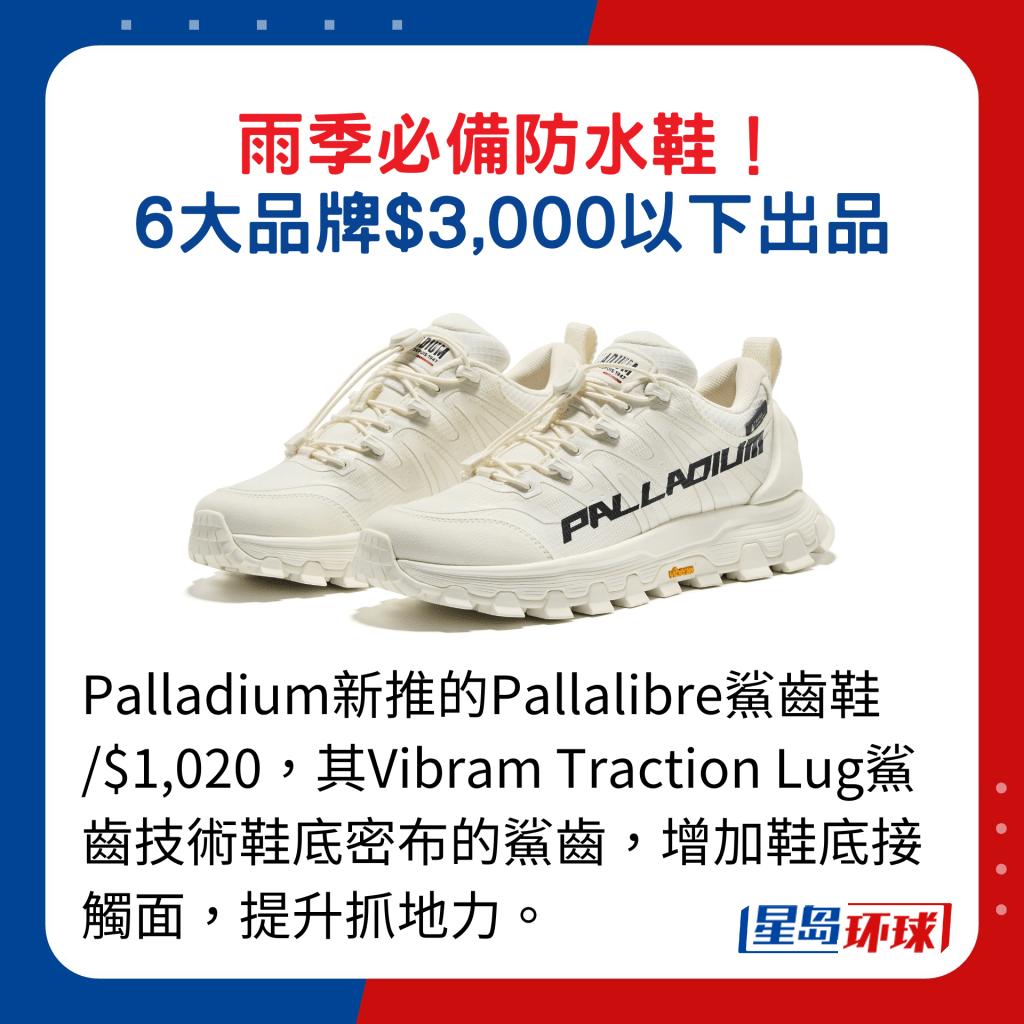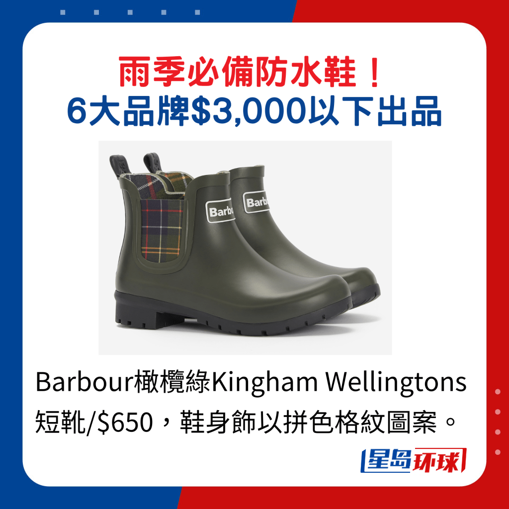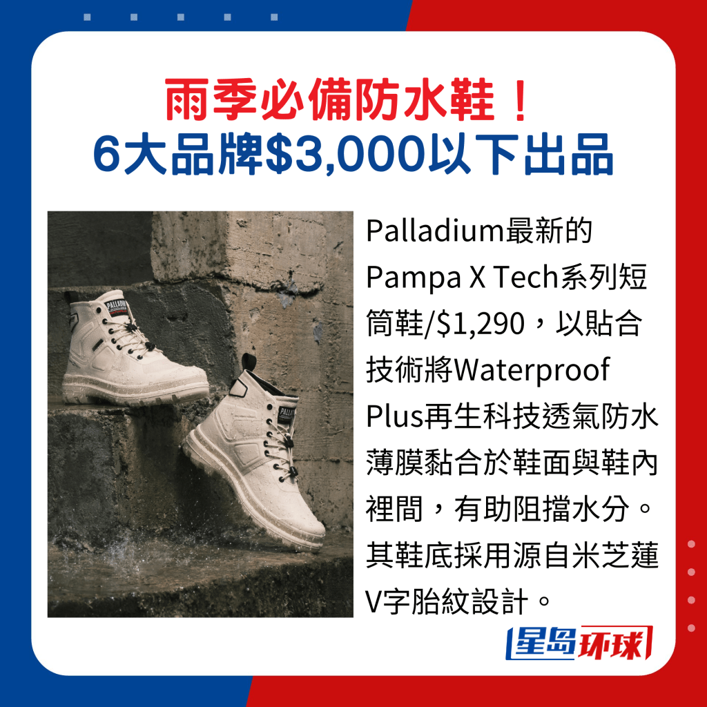 短靴款近年大熱,擁有三張英國皇室認證的英倫品牌Barbour推出的短筒矮跟雨靴,從品牌經(jīng)典的Chelsea靴款擷取靈感,鞋身用上拼色格紋與單色設(shè)計,滿載英倫韻味,以之配襯短褲或短裙,能凸顯修長美腿。 來自法國里昂的軍靴品牌Palladium以防水鞋打響名堂,今季新品中的Pampa X Tech系列短靴款,鞋面采用雙重防水涂層處理,配搭貼合技術(shù)將Waterproof Plus再生科技透氣防水薄膜黏合于鞋面與鞋內(nèi)櫳,防水又透氣,鞋底則用上源自米芝蓮獨特的V字形胎紋,配以蜂巢式彈力透氣鞋墊,提升穿著時的穩(wěn)定性與舒適感。
