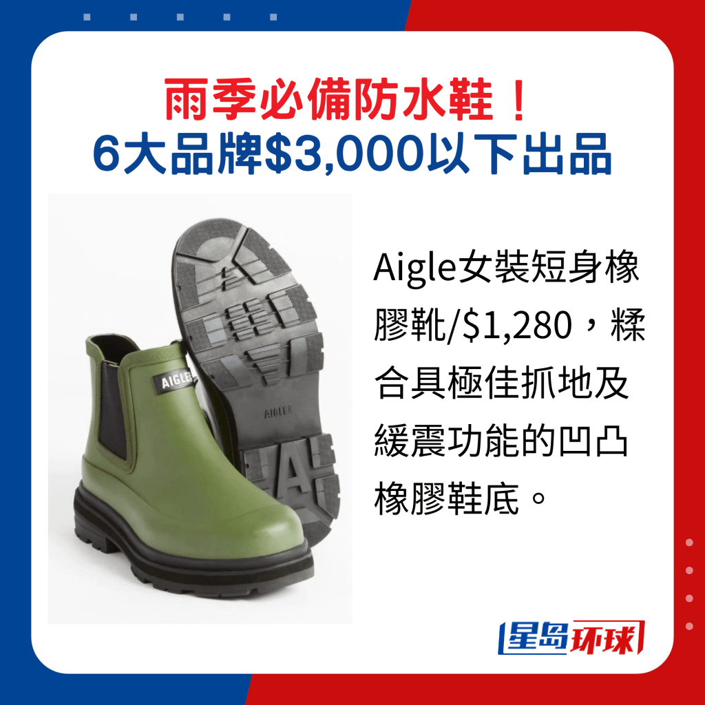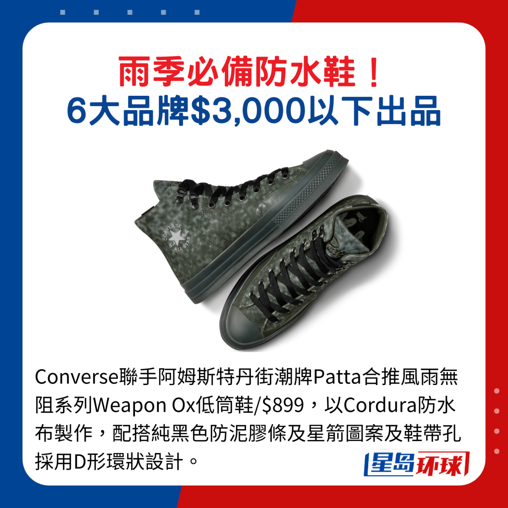 雨季開始,必備一對防水鞋,時下新設(shè)計不單止著重功能性,款式選擇亦多元化,當(dāng)中的型格短靴款及運動休閑鞋款都是大熱,適合上班或假日穿襯,今年夏天不妨添置一雙。