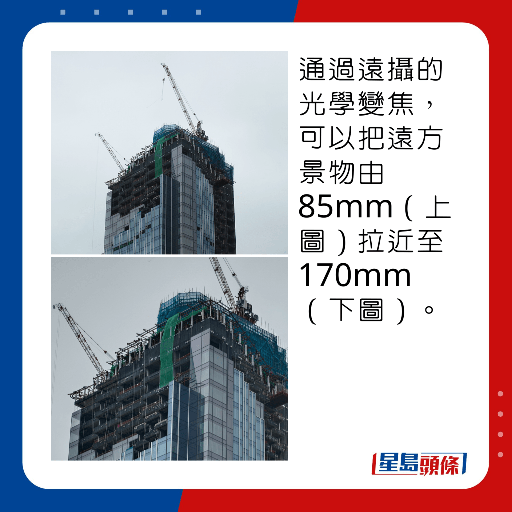通過(guò)遠(yuǎn)攝光學(xué)變焦,可以把遠(yuǎn)方景物由85mm(上圖)拉近至170mm(下圖)。