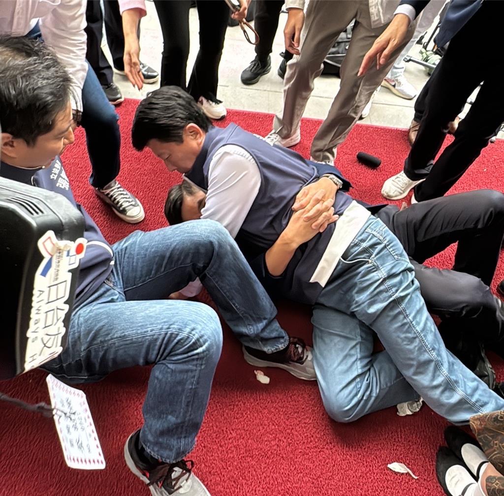 然而不只場(chǎng)內(nèi)沖突不斷,議場(chǎng)門口在7時(shí)就爆發(fā)嚴(yán)重推擠沖突,藍(lán)委甲級(jí)動(dòng)員搶在七點(diǎn)送案,與綠委發(fā)生推擠,可以看見女藍(lán)委出現(xiàn)尖叫聲。其中謝龍介和鍾佳濱近身肉搏、郭國(guó)文一度用用手推黃國(guó)昌的臉、王美惠更在混亂中把駐衛(wèi)警的小帽扯下。后來進(jìn)到議場(chǎng)內(nèi)可見到藍(lán)白“立委”成功搶占主席臺(tái),立委徐巧芯更在場(chǎng)內(nèi)“吹直笛”,陳玉珍也是全副武裝;進(jìn)到議場(chǎng)后,藍(lán)綠隔著主席臺(tái)互嗆、互罵,現(xiàn)場(chǎng)氣氛緊張。