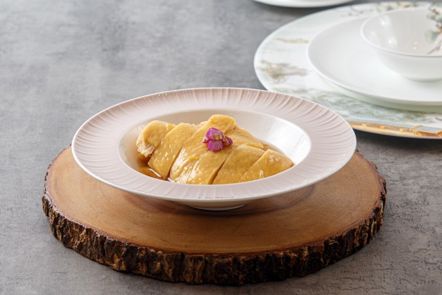 自然放養(yǎng)活動量較多的走地雞,取其肉質(zhì)結(jié)實及有彈性,特別配以八頭鮑魚炮制成鮑魚走地雞煲。 兩種食材燜煮至入味后,口感惹味軟嫩。 平原雞出名無添加激素、抗生素或類固醇,雞肉脂肪較少并富有嚼勁,原只浸泡在加入當(dāng)歸、瑤柱及蝦米的白鹵水中,再烹成惹味又鮮味的中菜—客家蔥油平原太子雞,入口肉嫩多汁、香氣撲鼻。