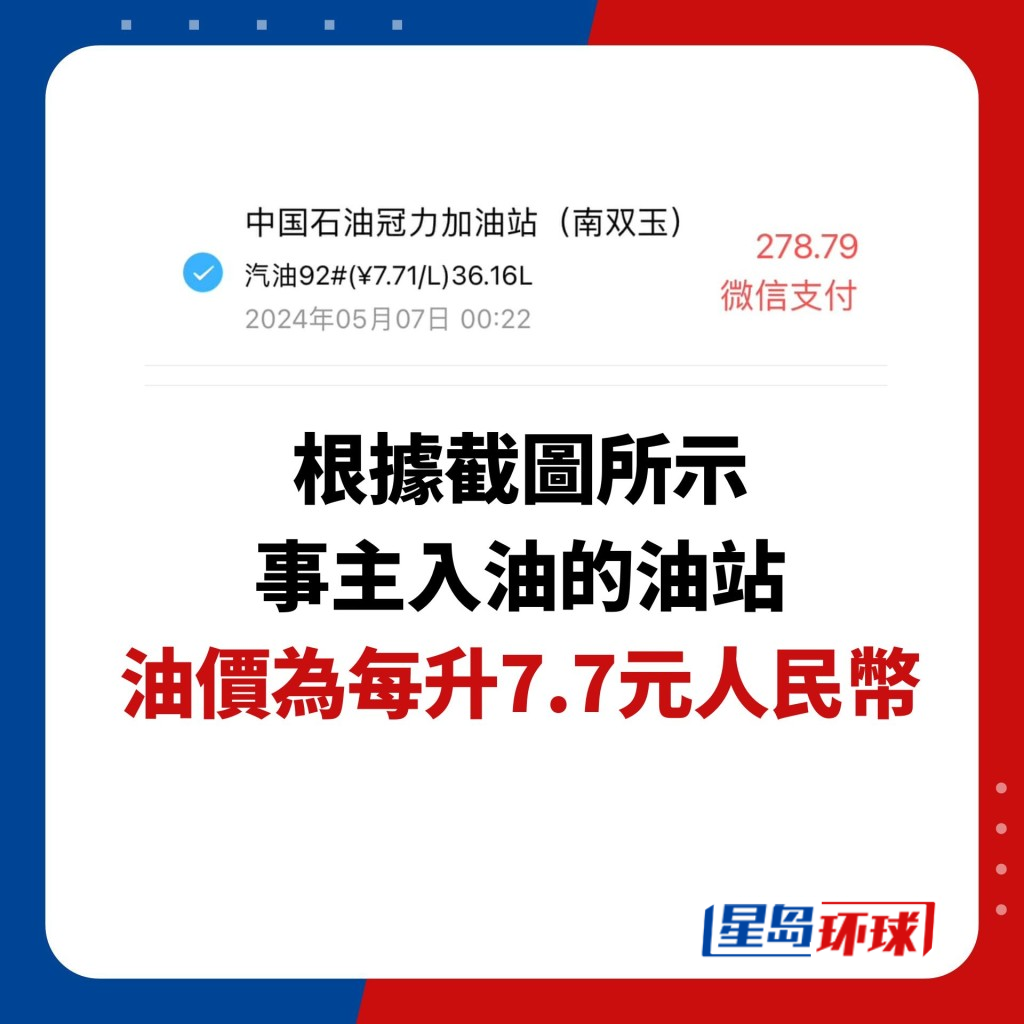 無可否認,該名車主北上加油的油價的確比香港價錢便宜得多,根據(jù)截圖所示,事主加油的油站,油價為每升7.7元人民幣。而香港目前的油價,則為25.09港元,差距是3倍有多。