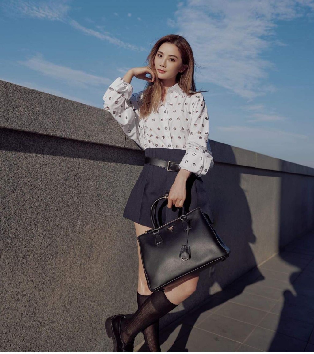 ▲阿Sa蔡卓妍穿著恤衫下襯打褶高腰短褲,配搭黑色絲襪及皮鞋,展現(xiàn)上班造型的時尚魅力。 (圖片來源:IG@choisaaaa)