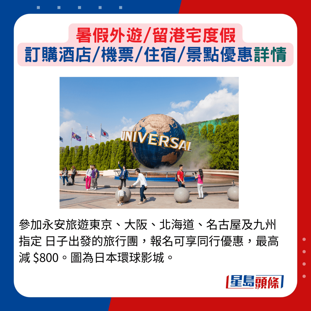 參加永安旅游東京、大阪、北海道、名古屋及九州指定日子出發(fā)的旅行團,報名可享同行優(yōu)惠,最高減 $800。 圖為日本環(huán)球影城。