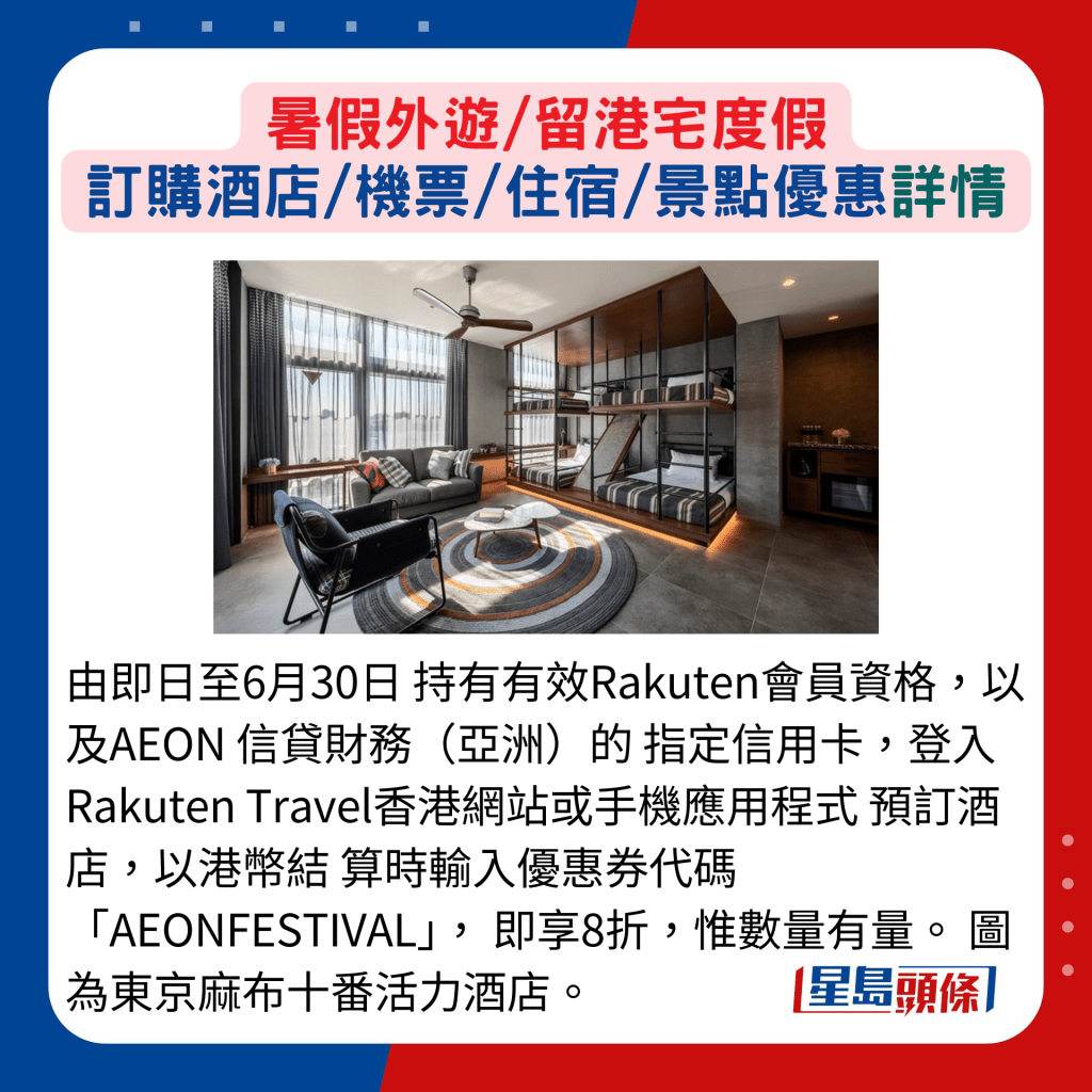 由即日至6月30日持有有效Rakuten會員資格,以及AEON 信貸財務(wù)(亞洲)的指定信用卡,登入Rakuten Travel香港網(wǎng)站或手機應(yīng)用程序預(yù)訂酒店,以港幣結(jié)算時輸入優(yōu)惠券代碼AEONFESTIVAL,即享8折,惟數(shù)量有量。 圖為東京麻布十番活力酒店。