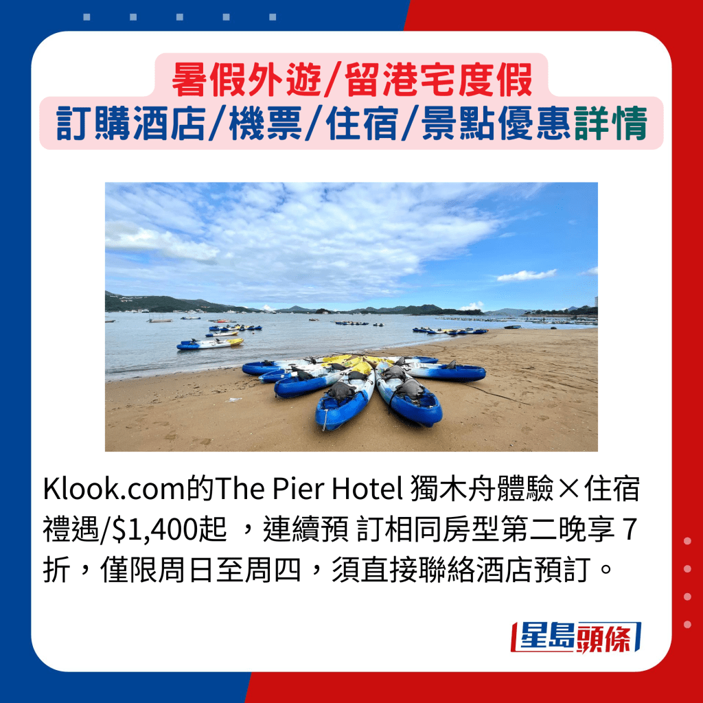 至于Klook.com推出西貢The Pier Hotel住宿連餐飲優(yōu)惠,其中獨木舟體驗×住宿禮遇,包括獨木舟租用及24小時私家車泊車優(yōu)惠等,預(yù)訂相同房型第二晚7折,限周日至周四,須直接聯(lián)絡(luò)酒店預(yù)訂。